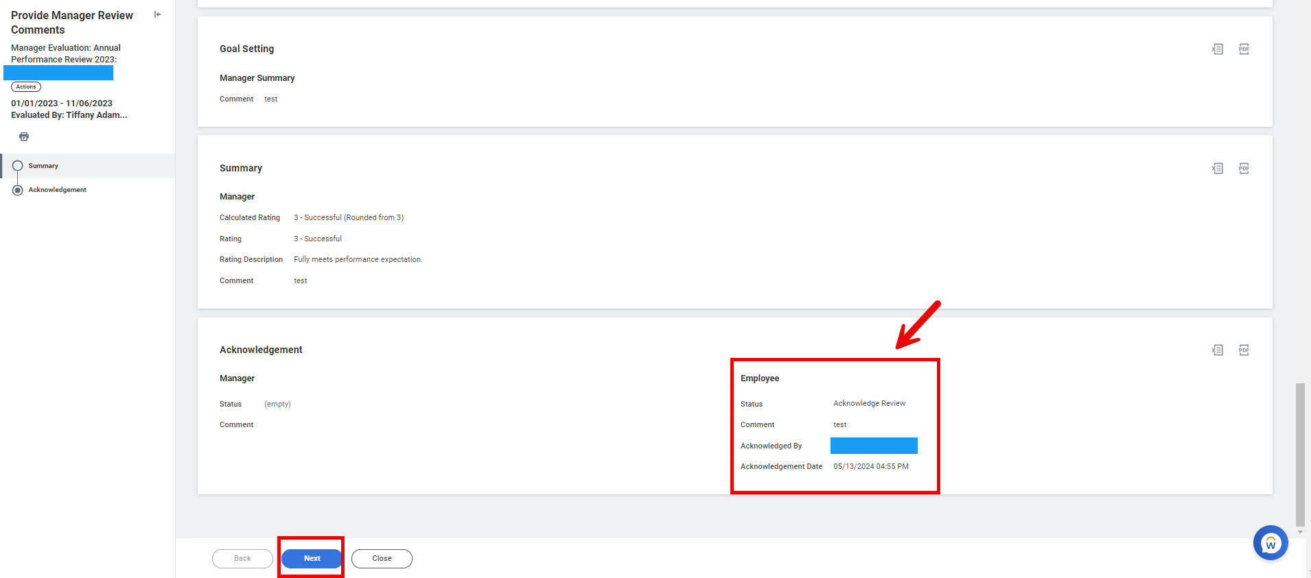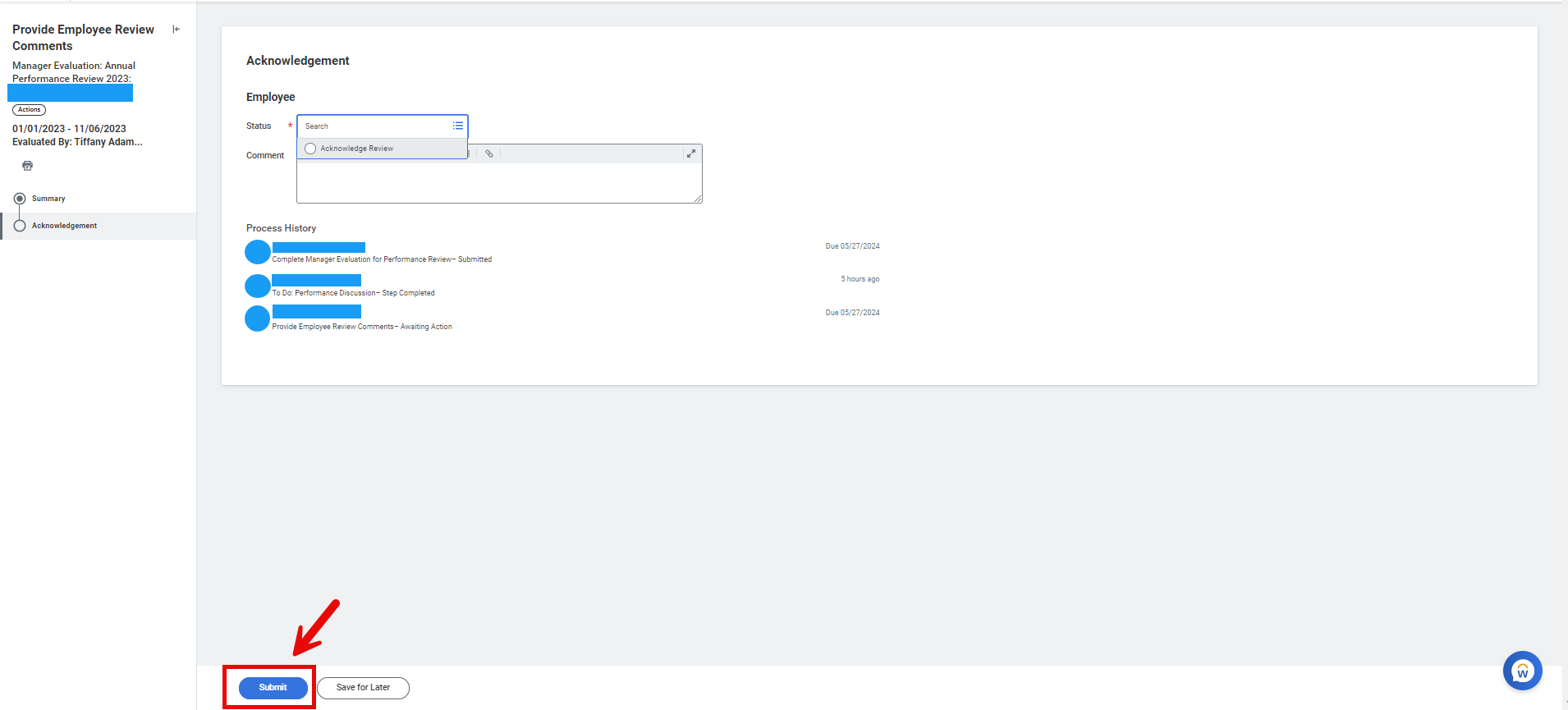 5. Once the employee has reviewed the contents, they click on Next and choose Acknowledge Review from the Status box, leave any desired comments, and click Submit.